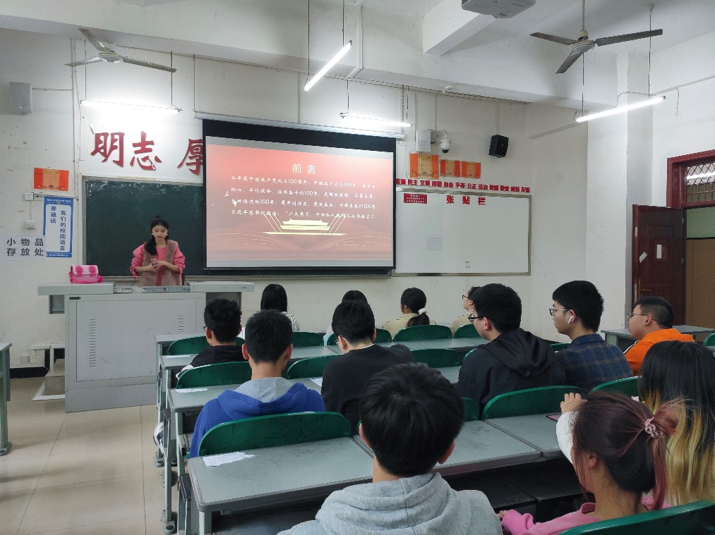 活动开始前,由各班团支书讲解党史的知识,讲述了党发展期间的重大历史事件和人物,生动形象地告诉我们中国共产党初心和使命,一切为了人民,人民至上,让大家更加深刻地感受到中国革命、建设道路之艰辛,人民幸福生活之不易,当代大学生一定要发扬红色传统,传承红色基因。