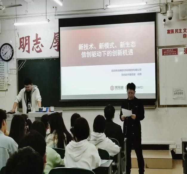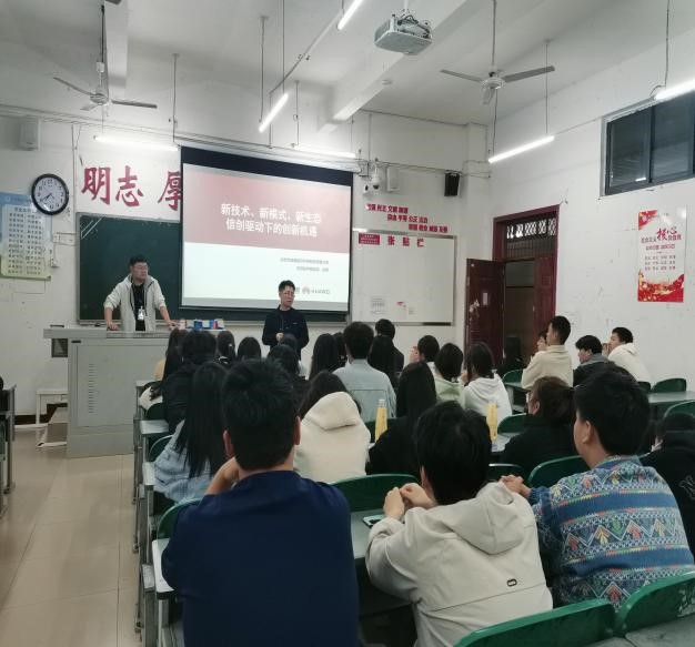 讲座分为3个模块,首先邓林书记介绍了此次讲座的意义,分析国家政策及大环境下的社会经济发展,在当前数字化时代,信息技术的快速发展对各行业的发展和进步起到了重要作用。 第二模块由俞翔老师通过信创产业的发展、信创产业链供应、华为信创体系建设、基础软件认证等4个方面的讲解,为学生们重点分析新技术、新模式、新生态信创驱动下的创新机遇。对于一个国家而言,只有拥有自主可控的信息技术才能在竞争中立于不败之地。因此,国产化基础软件作为信息技术的重要基础,其在国家信息化建设中的地位显得尤为重要。第三个模块是互动环节,俞翔老师通过幽默的讲解,案例分析,使得学生们能快速的理解什么是信创,学生们积极与老师互动,憧憬美好未来,相信他们在人生职业发展中定会大放光彩。