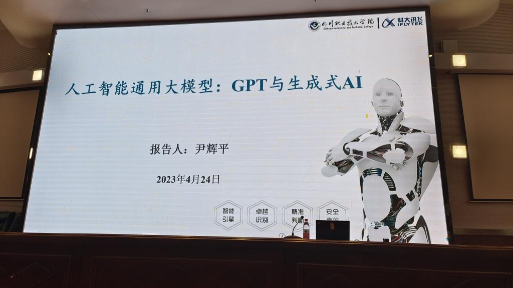 为了增强同学们的学习热情、了解行业发展和CHATGPT驱动下的所带来的优势,让同学们能够更好地为自己的职业规划和未来发展做出决策,同时提高自身在相关领域的竞争力。4月24日,科大讯飞-高级工程师、讯飞教育AI研究院技术总监尹辉平老师来到四川职业技术学院为人工智能专业学生带来了“人工智能通用大模型:GPT与生成式AI”专题讲座,在学术报告厅举行。