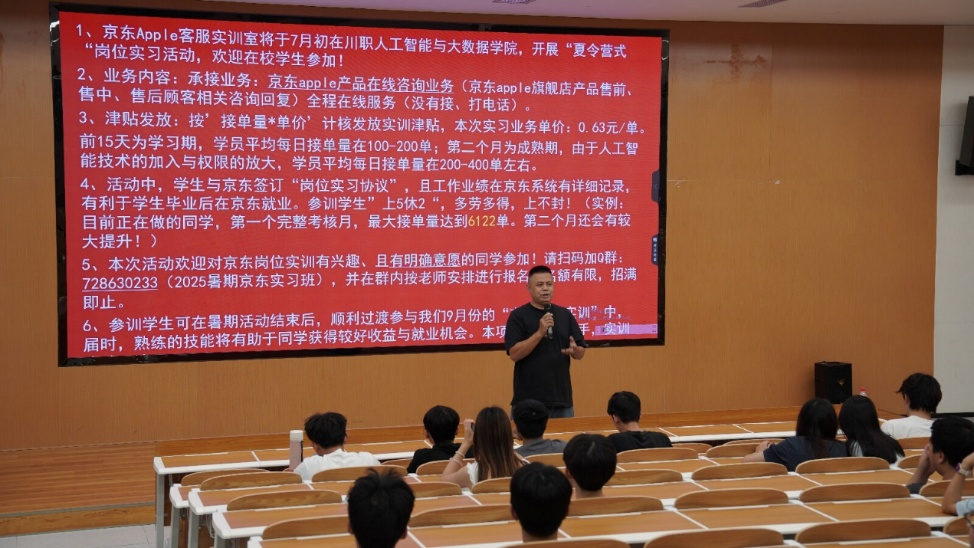 2025年6月19日“京东-川职校园实训室2025暑期夏令营活动”在龙凤校区敬业楼B5—101教室举办。这场宣讲活动由人工智能与大数据学院主办,学生会宣传部承办,出席此次活动的人员有:党总支书记唐权老师、党总支副书记邓林老师和京东分部戴总经理。