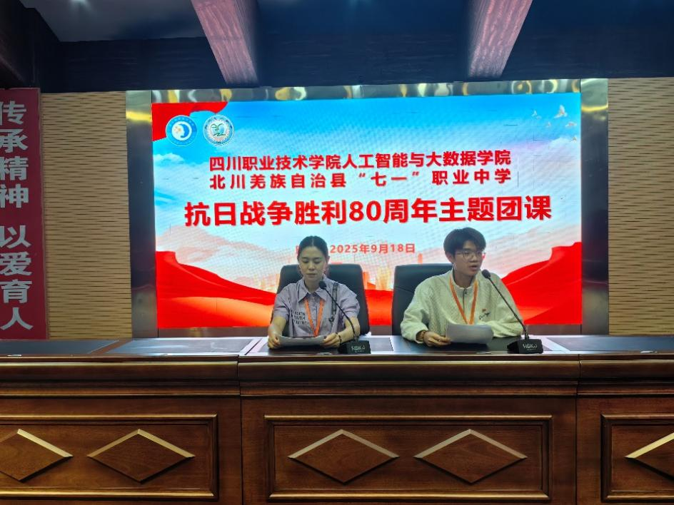 2025年9月18日,人工智能与大数据学院团委与共青团北川羌族自治县七一职业中学委员会召开2025年秋季学期第一次全体团员大会,全校团员齐聚一堂,共同开启新征程。会议由团委书记黄维主持,四川职业技术学院人工智能与大数据学院2023级网络3班周爽作为北川七一职中实习新任教师一同参与。