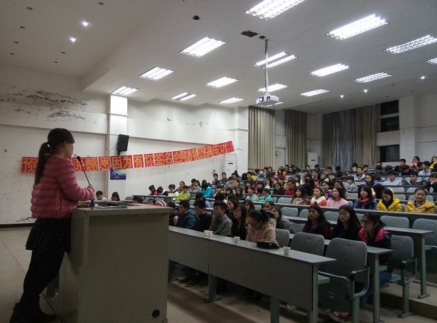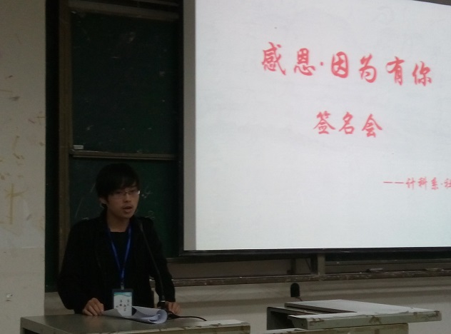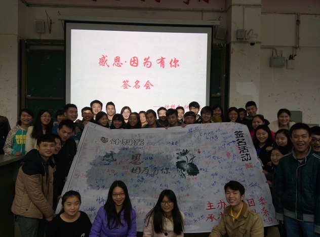 “感恩的心,感谢有你”,在这名为“感恩节”的一天,计科系在B区109教室举办了“感恩·因为有你”的签名会。会上,许媛老师、学生会主席黄志扬以及学生代表相继上台发言,述说了自己对感恩的理解,讲述了一个个关于感恩的故事,或关于他们自己,或他们身边的朋友,那一句句发自肺腑之言,传达着一颗颗炽热的感恩之心,让同学们对感恩有了新的认识。会议为同学们播放了视频“爱的奉献”,那一幕幕呈现在荧屏上的画面让人潸然泪下,随后吴瑕老师上台对同学们提出了寄望,希望同学们能怀揣着一颗感恩的心,做一个感恩的人.....时间如白驹过隙,在同学们的签名留影中“感恩·因为有你”活动画上了圆满句号。