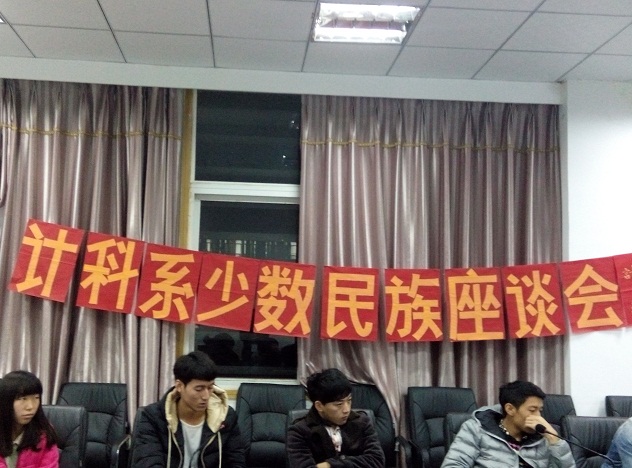 2014年11月25日星期二晚7:30信息楼406教室,计科系举办了少数民族学生座谈会。党总支书记陈俊、保卫处曾大志、辅导员赵久英、刘丽及许媛老师、本系的所有少数民族同学参加了本次会议。