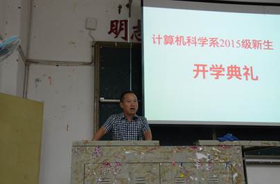 2015年9月9日上午8:30,计算机科学系2015级新生开学典礼在D区101教室隆重举行。开学典礼由系党总支书记陈俊同志主持,参加会议的有系主任韩文智、副主任唐权、教师代表周蓉及系二级科长、2015级辅导员(班主任)刘丽、廖茂淋、巫冬等,2015级全体新生到会。