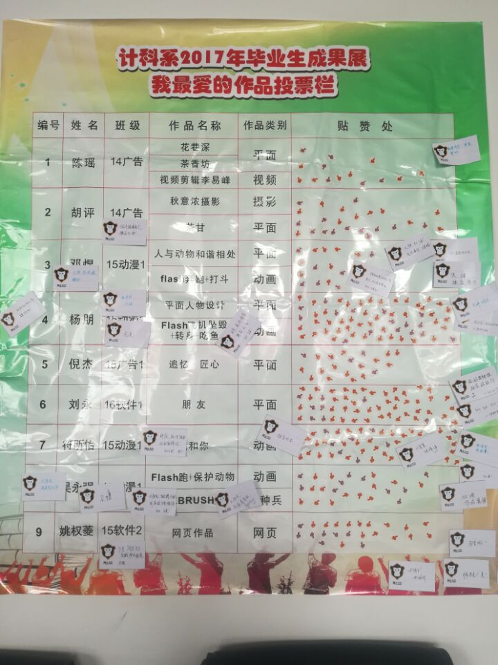 2017年6月我系在信息楼416举行了2015届毕业生成果展。活动主要展出了2015级学生的毕业作品,有平面设计、视频剪辑、摄影作品、包装设计、动画制作、3Dmax、网页制作、小游戏设计等。活动邀请了全系师生共同参加,评比,现场气氛异常火爆。最后在全系师生统统投票下选出来了我最喜爱的毕业生作品,杨朋、刘永、符昕怡分别获得一、二、三等奖。