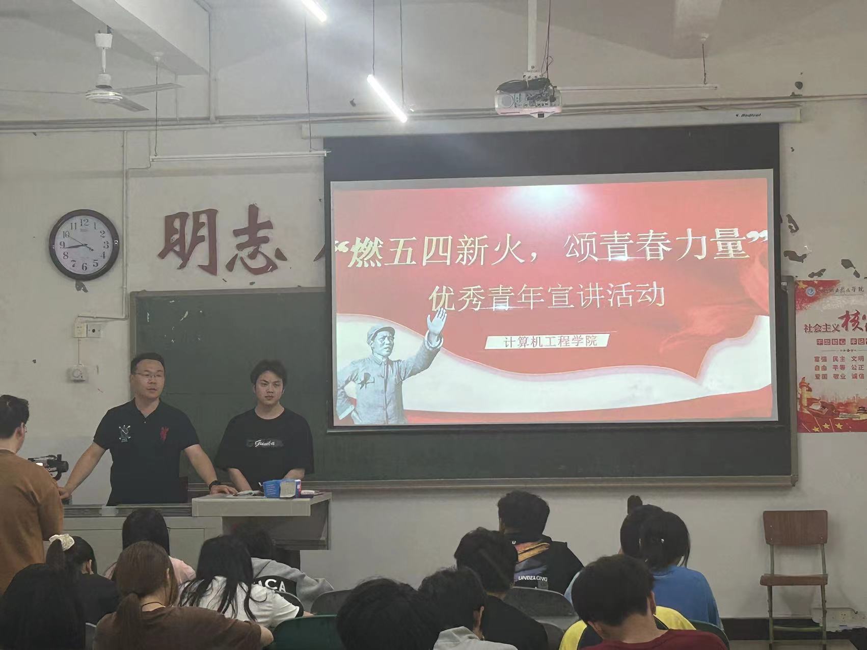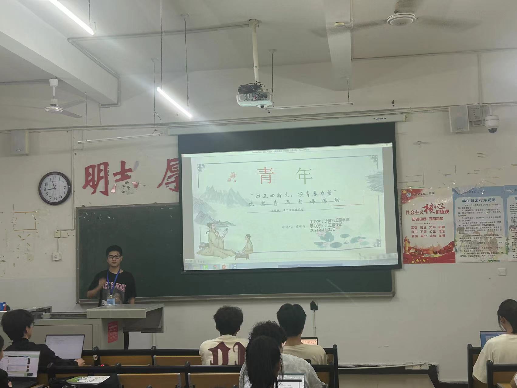 为了激发同学们的学习热情,培养他们的创新精神和实践能力,2024年4月22日星期一晚自习期间,由计算机工程学院宣传部组织的“青年教育宣讲”在尚学楼B区展开进行。这次宣讲邀请到的嘉宾有计算机工程学院团总支书记李遂江老师,宣讲人员有22软件4班王杰、23智能1班陈鸿、23数媒2班徐鑫雨、23动漫3班郭春平和23动漫1班关明扬。参与这次活动的观众人员为计算机工程学院23级的全体同学。