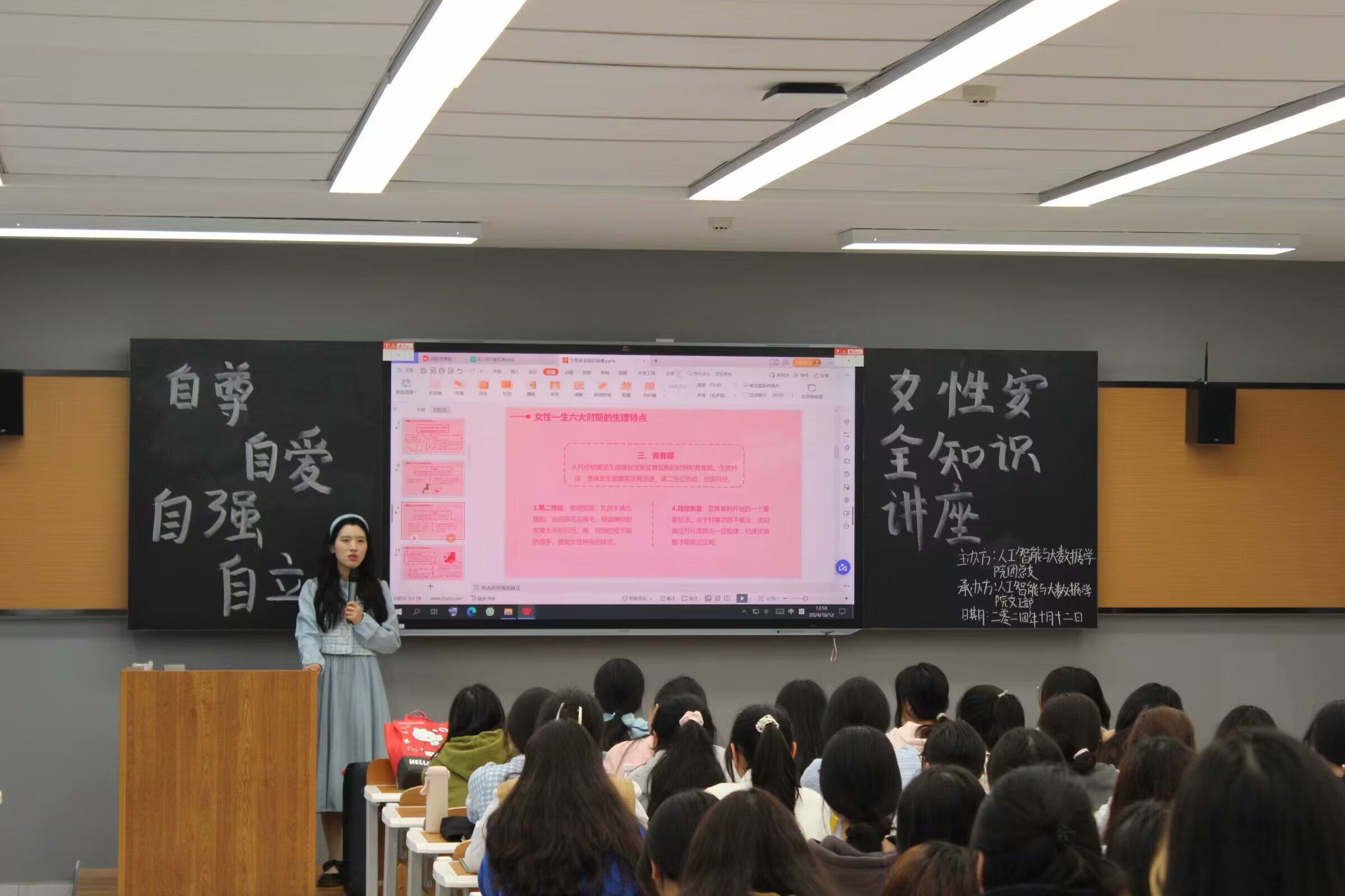 在当今社会,女生安全问题受到广泛关注,2024年10月12日,由四川职业技术学院人工智能与大数据学院团总支主办,学生会女工部承办的旨在提高女生安全意识,传授安全知识的围绕“女生安全知识”的讲座在B5-501成功举办。出席此次讲座的有人工智能与大数据学院辅导员王乙焱,女工部负责人,宣传部负责人以及24级女生,并邀请了人工智能与大数据学院辅导员王乙焱老师进行主讲。