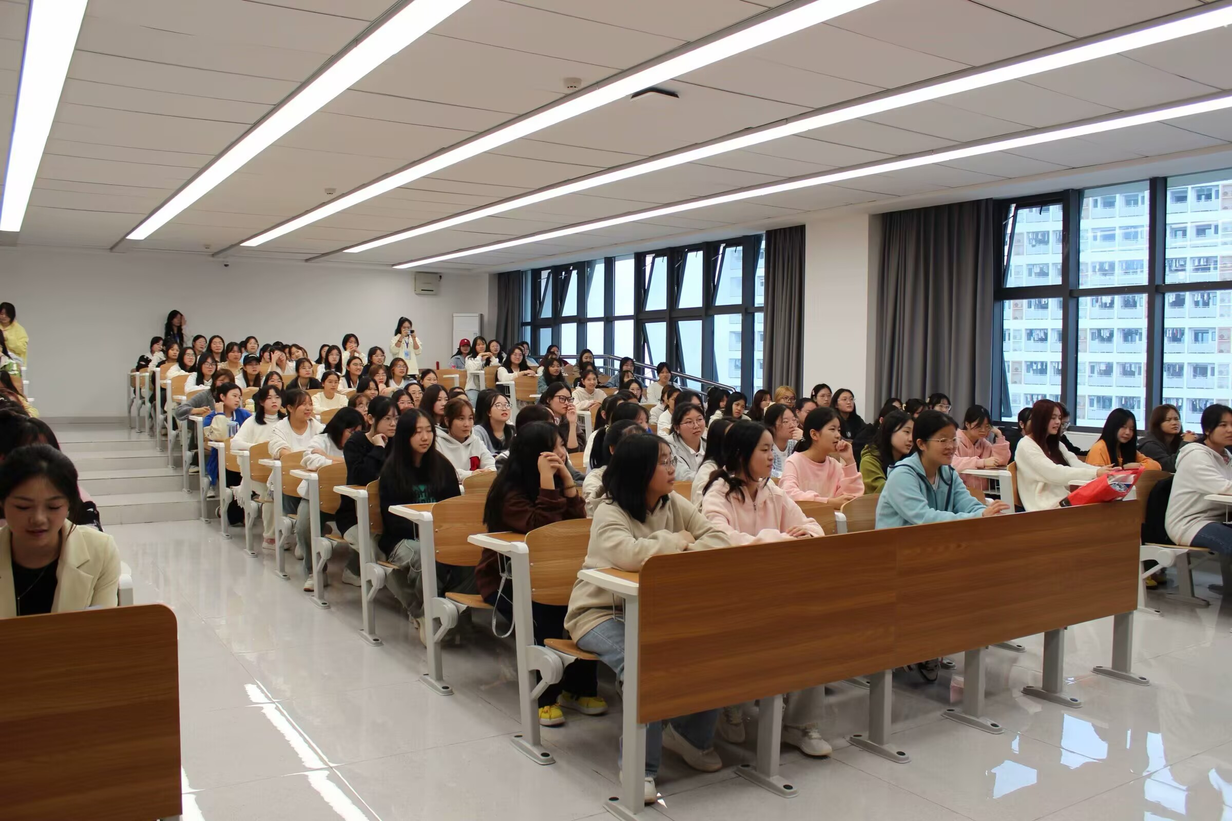 王乙焱老师首先介绍了女性一生六大时期的生理特点,不仅举例安慰女生们对自己的身体变化不要焦虑,还鼓励女生们要自信地展示自己的美。其次,王老师介绍了有关女性健康的“两大要害”,乳腺和宫颈,并普及了如何去预防这两种疾病。最后,王老师告诫了女生们一定要自尊,自立,自强,自爱,在谈恋爱期间一定要重视安全防范问题,并举出了一些事例,更加明了地解释了有关女性安全的知识。在此期间,王老师的讲解通俗易懂,现场氛围轻松和谐,同学们认真聆听讲座内容,增强了讲座的实用性。