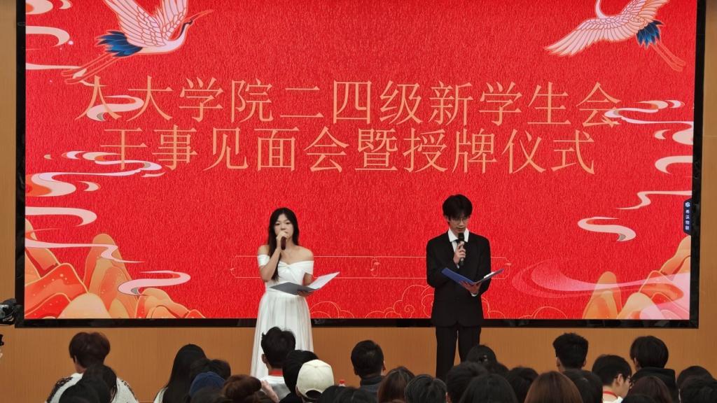 学生会执行主席杜宇轩发表了热情洋溢的讲话,他提到加入学生会是锻炼自我一个平台,也对新干事的加入表示热烈欢迎。随后,各个部门负责人纷纷对新干事做出真诚的寄语,表达了对新干事的期望与祝福,并为新干事们授牌。这一仪式象征着责任的传递,也标志着新干事们正式开启了自己在学生会这个大家庭中新的征程。