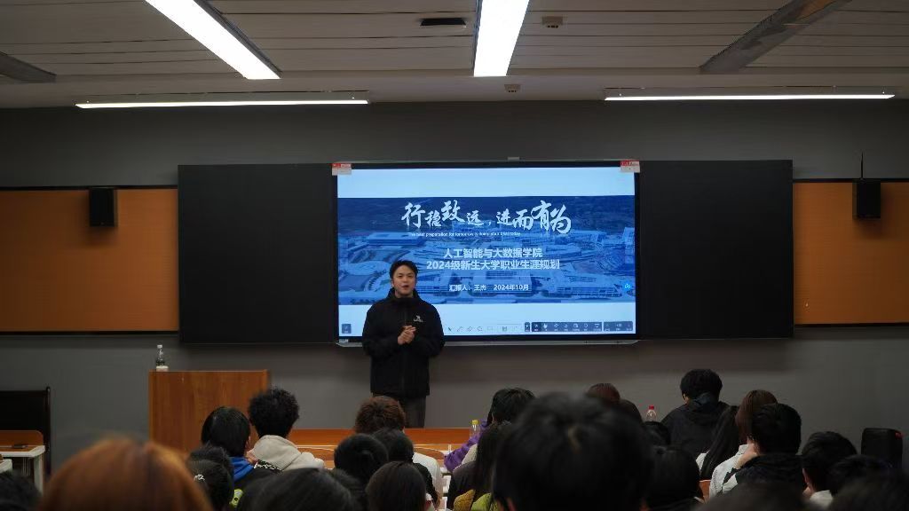 2024年10月31日,人工智能与大数据学院学生会维权部在B5-501开展了一场以“大学生涯规划”为主题的活动分享会。此次分享会邀请了彭莹老师和王杰学长。此次分享会旨在帮助同学们明确自己的未来目标和发展方向,了解自身的情况。