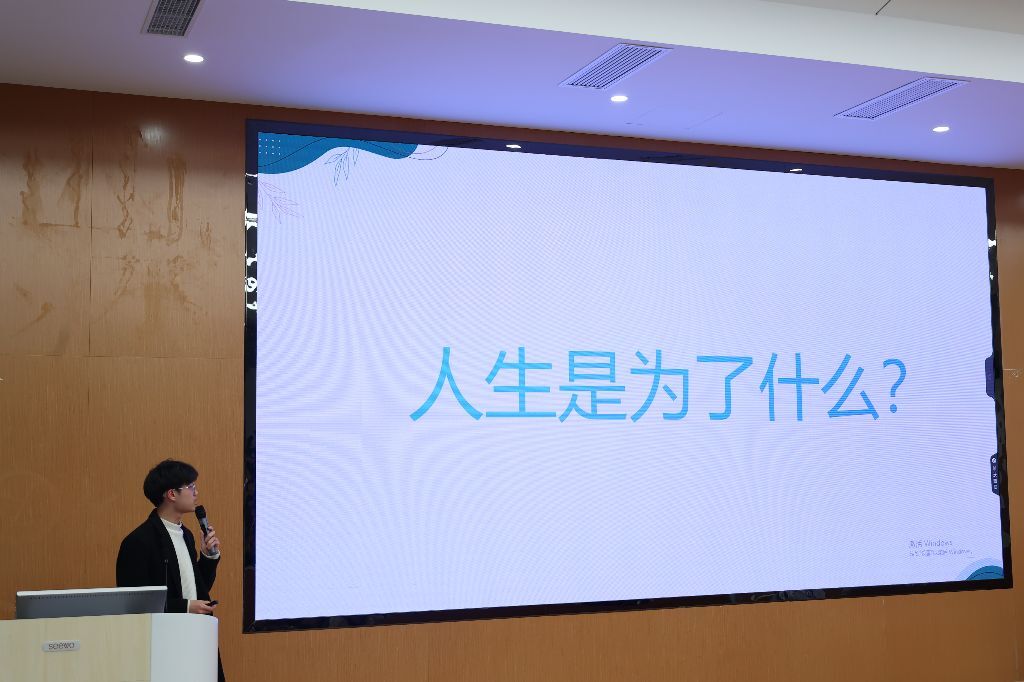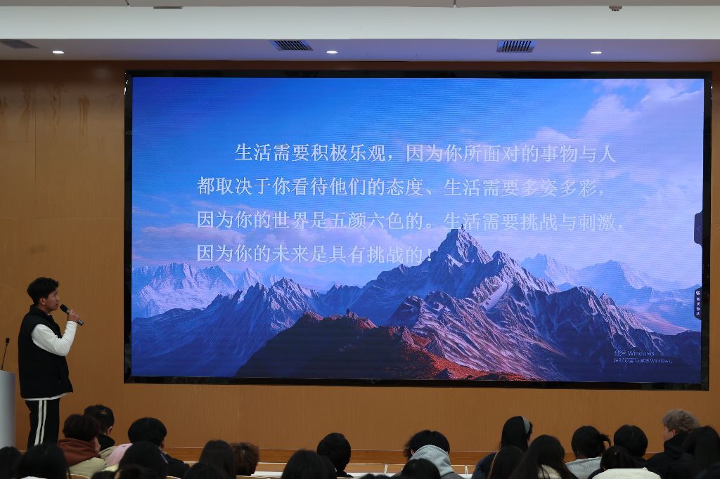 第二位主讲人是来自23网络技术4班的周爽。他抛出“人生是为了什么”的问题,认为要在迷茫中沉淀,在沉淀中爆发。他回忆在兼职岗位和社会实践中的收获,分享参加技能大赛从生疏到熟练的蜕变过程。他鼓励同学们积极参与各类活动,学习知识,结交朋友,勇敢迈出第一步展示自己。