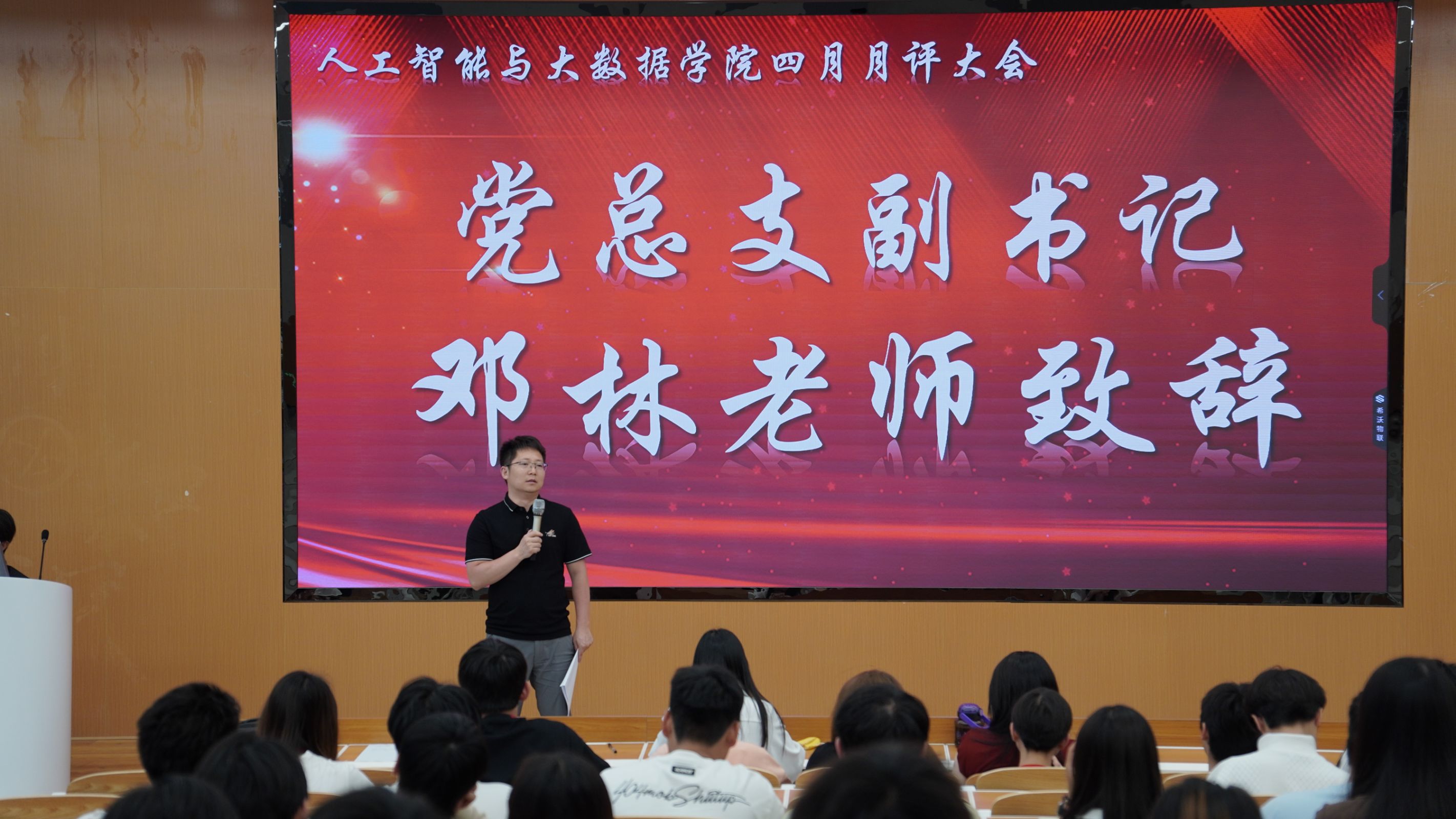 2025年5月8日人工智能与大数据学院于敬业楼B5-101教室举办四月月评总结大会。莅临此次活动的有党总支副书记邓林老师,团总支书记李遂江老师,24级导员刘丽老师和曾玲老师等多位老师出席。