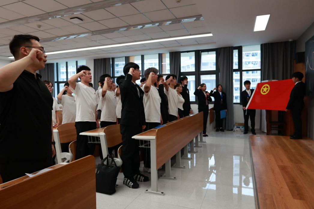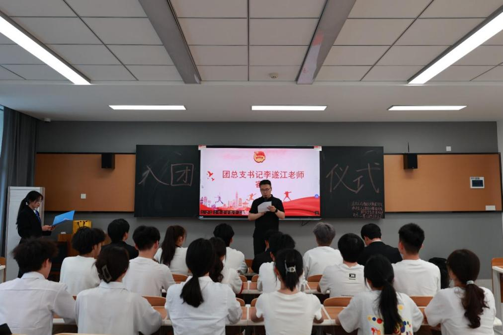 在领誓人的带领下,新团员们面向团旗,高举右手,庄严宣誓。洪亮而坚定的誓言在教室中久久回荡,这不仅是一句句承诺,更是新团员们对未来的决心和担当。最后,团总支书记李遂江老师对新团员们表示祝贺,并提出了期望。希望大家牢记入团初心,坚定理想信念,在学习上刻苦钻研,在生活中乐于助人,用实际行动践行入团誓言,为团组织增光添彩,为实现中国梦贡献青春力量。