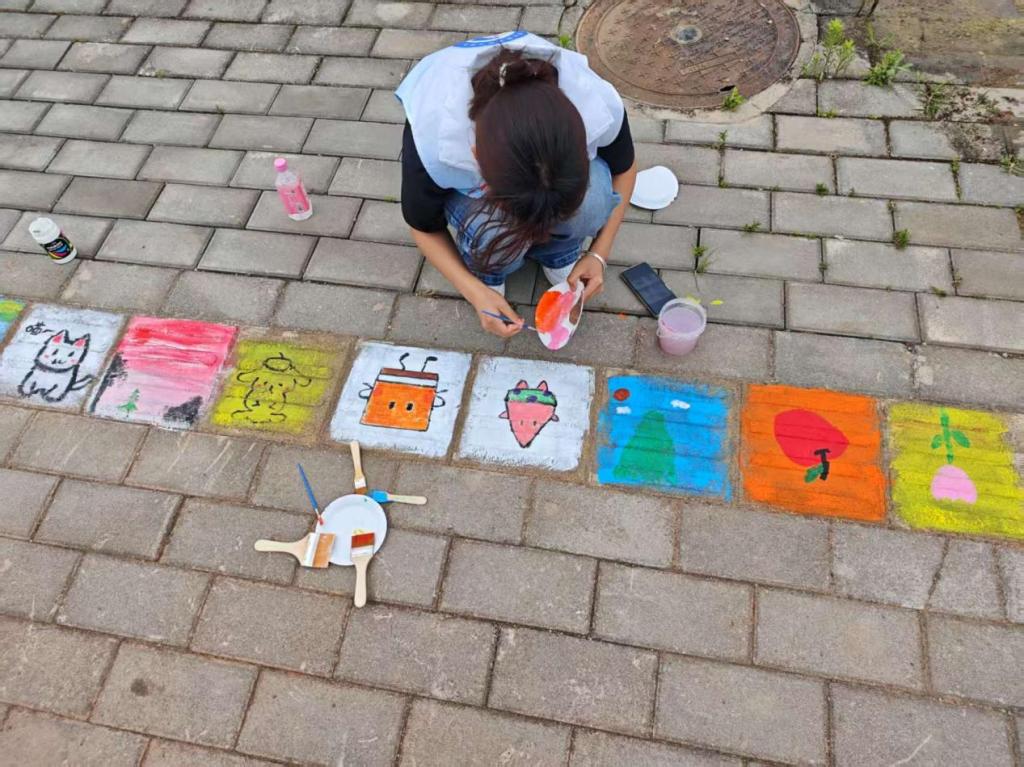 讲解结束后,各个小组立即开始行动,到达指定区域开展盲道绘画创作。活动现场,同学们热情高涨、分工明确,有的人负责勾勒图案轮廓,有的人专注填充色彩。大家以丰富的想象力和精湛的画工,在盲道上绘制出一幅幅生动有趣的图案,让原本单调的盲道焕发出勃勃生机。