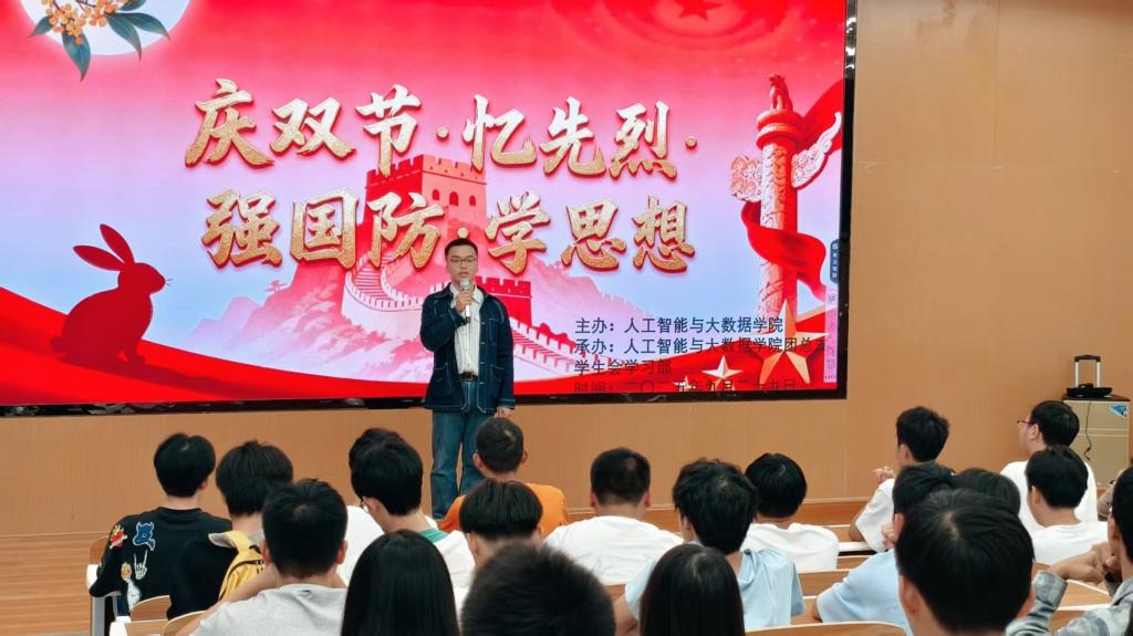 2025年9月29日,在四川职业技术学院龙凤校区敬业楼B5-101举办“庆双节·忆先烈·强国防·学思想”主题教育活动。本次活动由人工智能与大数据学院团总支学生会学习部举办,并特邀辅导员李朕鑫老师出席,旨在传承红色基因、强化国防意识。