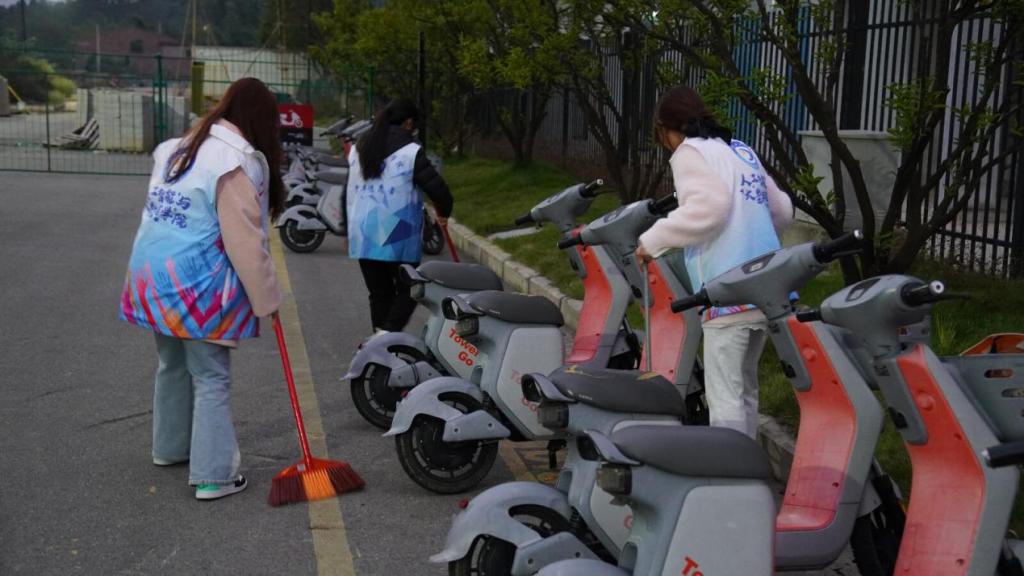 活动前,生活服务部负责人提前规划分工,将参与成员分为九组,明确各组负责区域,涵盖校门口停放区、教学楼公共区域、走廊通道等九个重点区域。