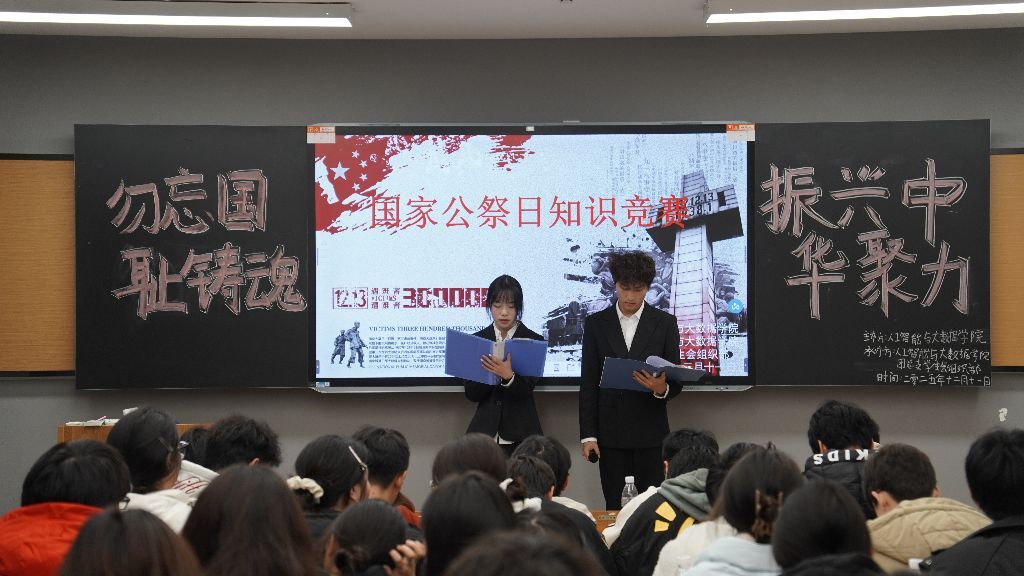 为引导学子铭记历史、传承爱国精神,凝聚振兴中华的青春力量,2025 年 12 月 11 日,由人工智能与大数据学院组织部主办的 “勿忘国耻铸魂,振兴中华聚力” 知识竞赛活动在敬业楼 B5-501 教室顺利开展,各部门负责人莅临现场观摩赛事。