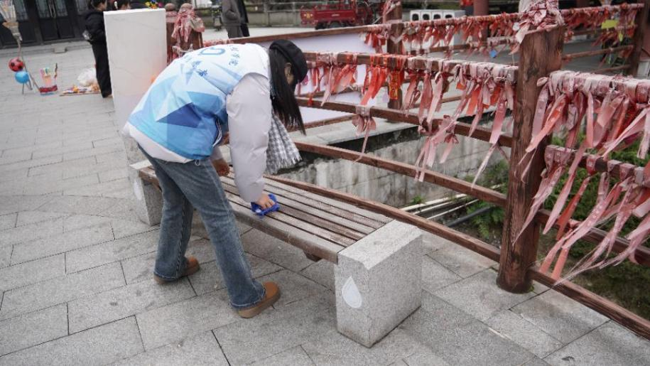 活动伊始,志愿者们迅速集结,领取扫帚、垃圾袋、夹子、抹布等清洁工具后,按照预先划分的区域有序开展工作。他们重点对景区道路、台阶、绿化带等关键区域进行全面清扫,细致清理地面烟头、纸屑、落叶及杂草等杂物,同时对景区内的公共长椅进行擦拭保洁,不放过任何一处卫生死角。