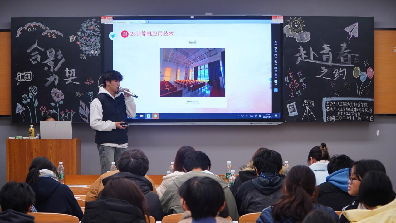 活动现场氛围热烈,各班代表依次上台,生动讲述班级合影背后的故事与意义。有的照片定格于校园林荫道上的欢笑瞬间,有的记录了实训课上的协作时刻,每一张照片都承载着班级的凝聚力,洋溢着青春的朝气,让在场师生深切感受到了数智学子的青春活力与团结情谊。