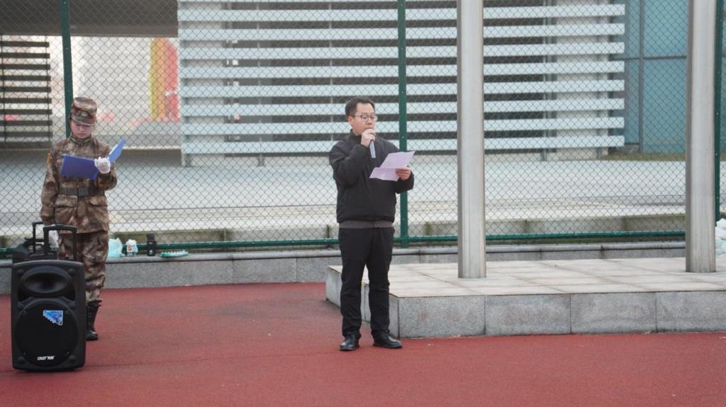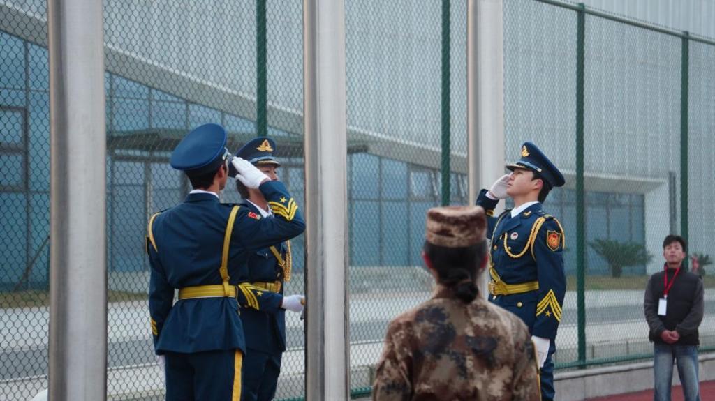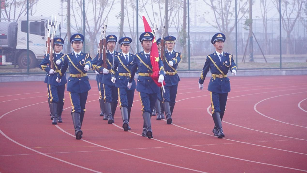 晨光微熹,国旗护卫队身姿挺拔、步伐铿锵,庄严护送国旗至升旗台。伴随着雄壮嘹亮的《义勇军进行曲》,全体师生肃立注目,五星红旗冉冉升起,在凛冽晨风中高高飘扬,激荡着每一位青年学子的爱国情怀。