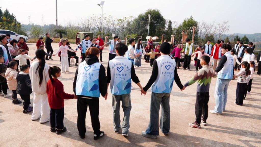 随后的互动游戏环节将现场气氛推向高潮。“听数抱团”“抢凳子”等趣味游戏让孩子们尽情释放天性,一张张纯真的笑脸洋溢着无忧无虑的快乐;手工制作环节中,志愿者手把手教孩子们折千纸鹤、编蝴蝶结,每一件作品都承载着童真、创意与彼此间无声的陪伴。与此同时,志愿者们还主动走近村中老人,陪他们拉家常、聊往事,关切询问生活起居与身体健康状况。老人们慈祥含笑,孩子们安静聆听,一老一少之间流淌着跨越代际的温情,绘就了一幅尊老爱幼、邻里和睦的乡村和谐画卷。