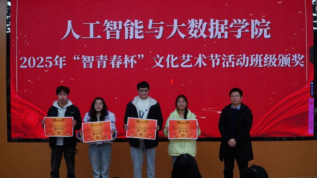 在热烈的掌声中,大会进入表彰环节。主持人公布各班级综合表现成绩,评分涵盖参与度、节目质量、现场组织力与创新性等多个维度,全面展现班级凝聚力与创造力。出席老师为获奖集体颁发荣誉证书与奖品,现场欢呼不断,既是对卓越表现的嘉奖,更是对全体师生倾情投入的致敬。人工智能与大数据学院团总支书记李遂江老师作总结讲话,充分肯定筹备团队的辛勤付出与各班级的踊跃参与,并系统梳理了本届艺术节在形式创新、覆盖面广、育人实效等方面的突出成果。党总支副书记邓林老师高度评价艺术节的文化价值,指出:“校园文化是学院发展的灵魂,是滋养青年成长的精神沃土。”他勉励同学们继续以主人翁姿态投身文化建设,并对未来活动在科技融合、专业特色、品牌打造等方面提出殷切期望。