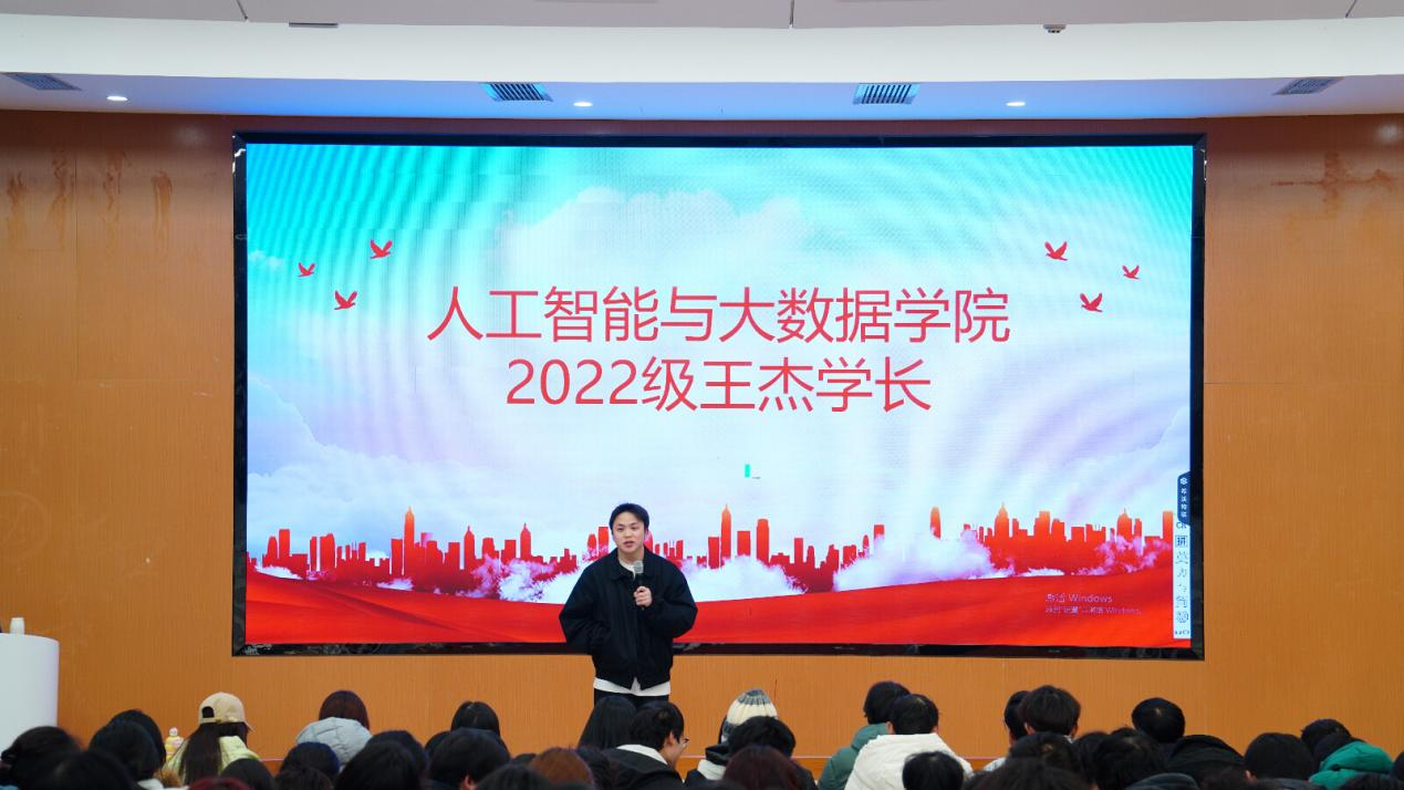 为帮助大一学子明晰学业发展方向,汲取优秀学长的成长经验,人工智能与大数据学院于 2026 年 1 月 11 日在敬业楼 B5-101 教室举办 “薪火相传,风采相承” 学生风采分享会。本次活动特邀 22 级学长王杰分享专升本的奋斗历程,为学弟学妹们答疑解惑、指引前行方向。辅导员李朕鑫受邀出席本次活动。